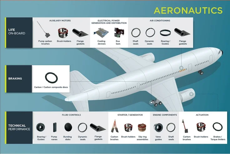 碳和石墨材料因其具有轻质特性、导电性和高温承受能力而被用于航空航天领域,可帮助该领域实现轻量化设计。它们的以上特点,也能够满足那些追求耐热性、导电率、轻量化设计的应用领域的需求。