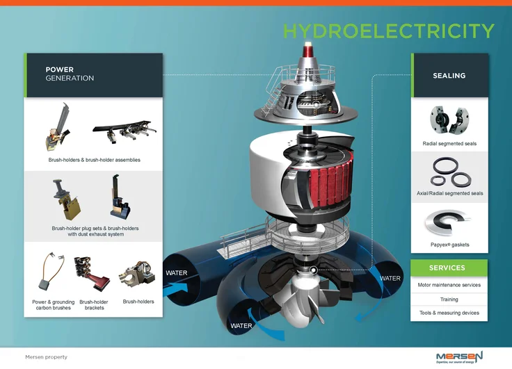 美尔森的碳刷用于高效性能的水电发电机涡轮环应用上。