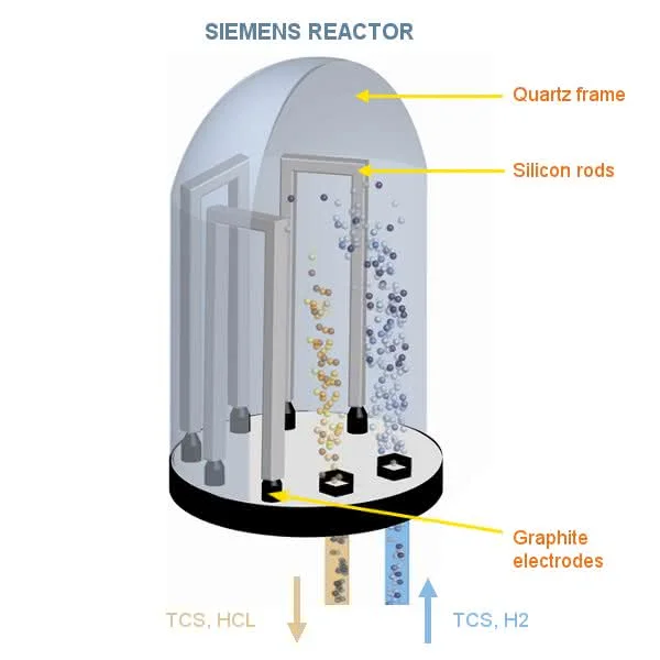 气态三氯硅烷(TCS)在高温下冲透沉积室并分解,在热硅芯上沉积纯硅。